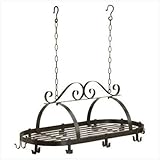 An intricate swirl design makes this wrought iron hanging pot holder with 10 hooks a useful work of art for the kitchen. 31-5/16-inch by 15-7/8-inch by 11-7/8-inch high.